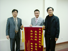 最后,陈孙玫经理从邰峰副主任和浙江林学院党委宣裕方副书记手中接过了“致富思源,富而思进,乐于助人,奉献爱心”的锦旗,这时,全场响起了经久不息的掌声……