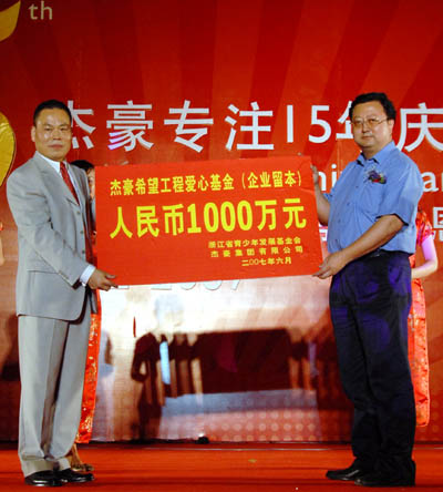 据悉,2007年“杰豪希望工程爱心基金”将划拨100万元用于帮助家庭经济困难的大、中、小学生顺利完成学业。“杰豪希望工程爱心基金”设立后资助的第一批对象,是来自于永嘉乌牛、潘坑和西岙的15名家庭经济困难的学生。在庆典晚会上,杰豪一次性向这15名贫困学生送上了两学年的生活费用,并承诺将尽力帮助这15名学生完成学业,帮助他们实现“象牙塔”的梦想。